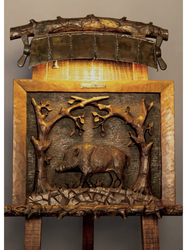 J. Bradley Greenwood, a leading master furniture maker and artist, is recognized for his intricate relief carvings, hand tooled surfaces, rough sawn surfaces, and striking combinations of hardwoods. Also noteworthy is his remarkable talent to integrate antique and long-standing resources into his custom handmade furniture. He creates entertaining furnishings that contain distinctive features such as dioramas, animatronics, games, secret compartments, and more.