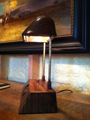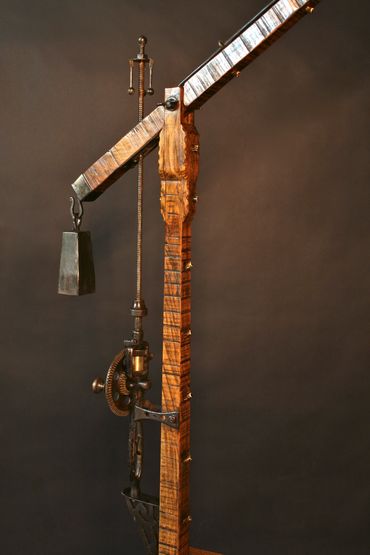 Materials: hardwoods, antique spoke pulleys and counter-weight, (Assayer's Lamp: antique hand-cranked drill and handmade governor) steel mesh hand- stitched shade, rock screen, forged steel, vintage style Edison bulb, fine brass dimmer, copper leaf inlay