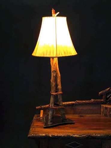 A masterful wildlife high relief carving on a solid walnut slab depicts a mama grizzly and cub in the woodlands. Displayed upon a hand carved easel, the lamp of peeled bark trimmed with oak branches, highlights the carving and provides a beautifully soft, warm glow. This is a versatile piece that is easy to enjoy in many beautiful settings.