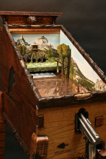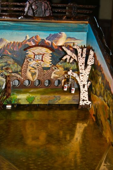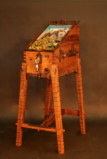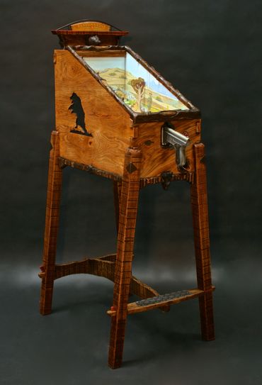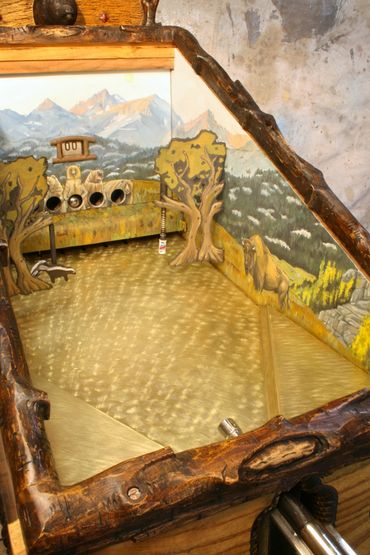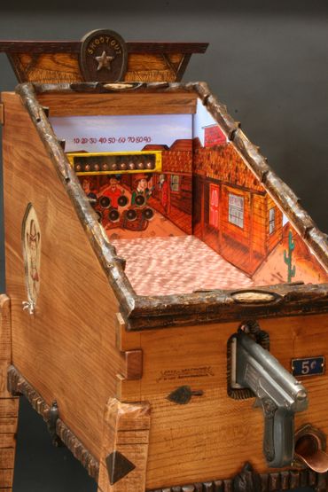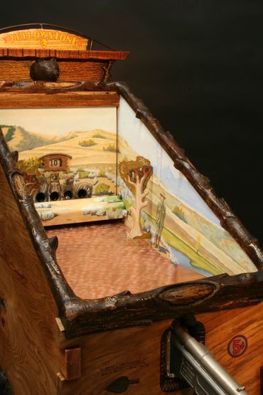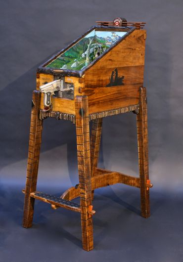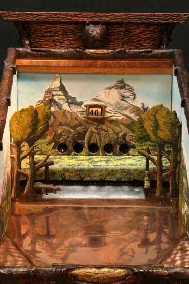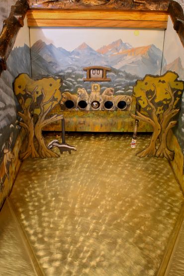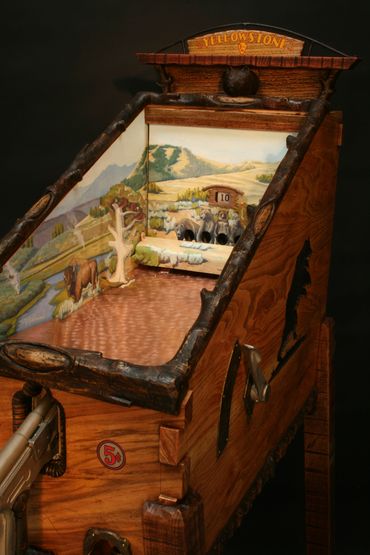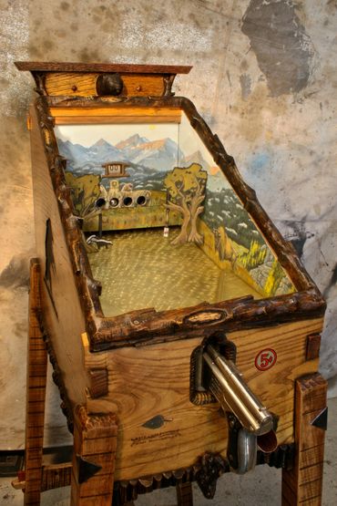 The prairie dog themed target gallery games provide hours of fun within a masterfully carved cabinet. Inside are striking original paintings by Jesse B. Greenwood.