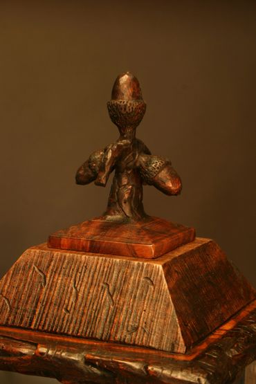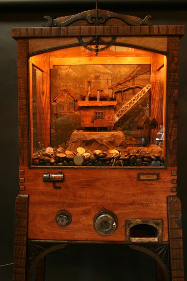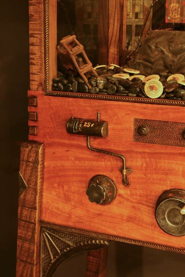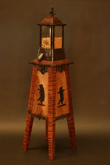 Brad Greenwood has restored vintage nut machines to their former glory. There are no electrical or computerized components. The artist has expanded the design concept of the vintage machine by creating a classic western style stand with whimsical details such as inlaid bear silhouettes, twig accents and intricate layers of carvings. The top features a whittled cluster of acorns that functions as a twisting closure. A hidden leather-lined coin drawer has been added beneath the stand to catch the profits.