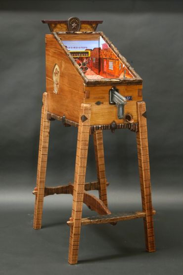 Brad Greenwood’s series of small-scale mechanical shooting gallery games is reminiscent of the first half of the twentieth century. This is a fully operational, moving mechanical target game without electrical or computerized components. Instead, the artist has made use of restored, heavy-duty, vintage game parts (similar to those used in public play lands such as Coney Island) to create a collectible furniture piece that is entertaining, durable, and innovative.
