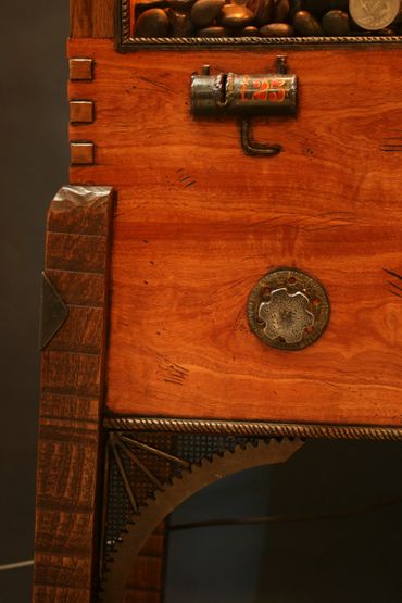 When the owner is ready to retrieve the coins, there is a hidden release and key (located at the bottom right side of the stand within the twig work).