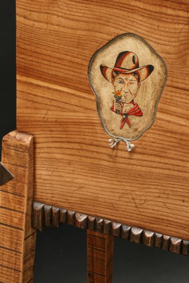 The artist's dedication to time-honored virtues and traditional workmanship is evident in his hand-carvings, exposed joinery, and rough sawn surfaces that emphasize the artist’s nod to a nostalgic western flair.