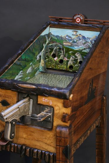A striking combination of hard woods has been flawlessly combined with a hand cut steel target scene of bears, prairie dogs, mountains, Old West towns, National Park themes, and more. The original painting on steel is paired with two painted canvases to complete the panorama. Spinning objects, moving targets and a scoreboard, create a fun and challenging game.